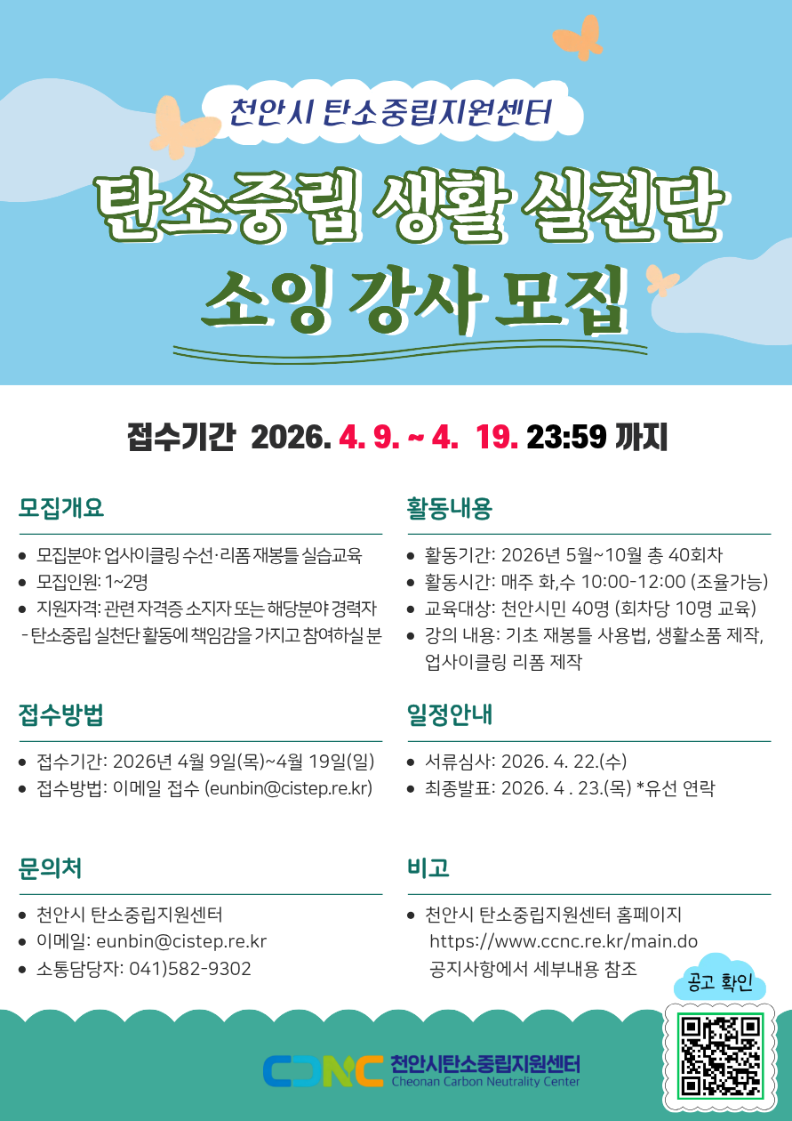[모집공고] (2026년 천안시민 탄소중립 생활실천단) 의류 리폼 업사이클링 교육 강사 모집(~4/19)